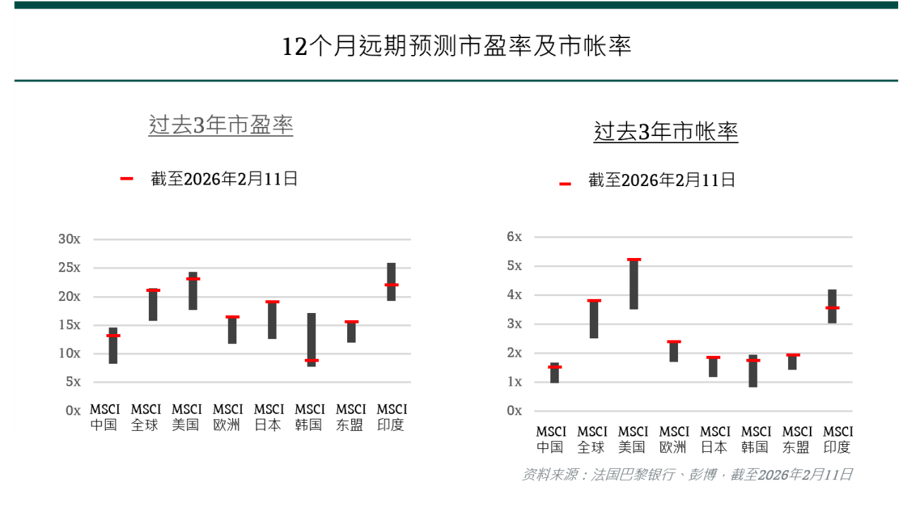 2025年香港/中国股市表现亮眼,MSCI中国指数全年大涨28%,表现优于MSCI美国、欧洲及日本指数。尽管许多市场交易价格接近或处于三年高位,香港及中国股市的估值相对同业仍相对合理(见下图)。