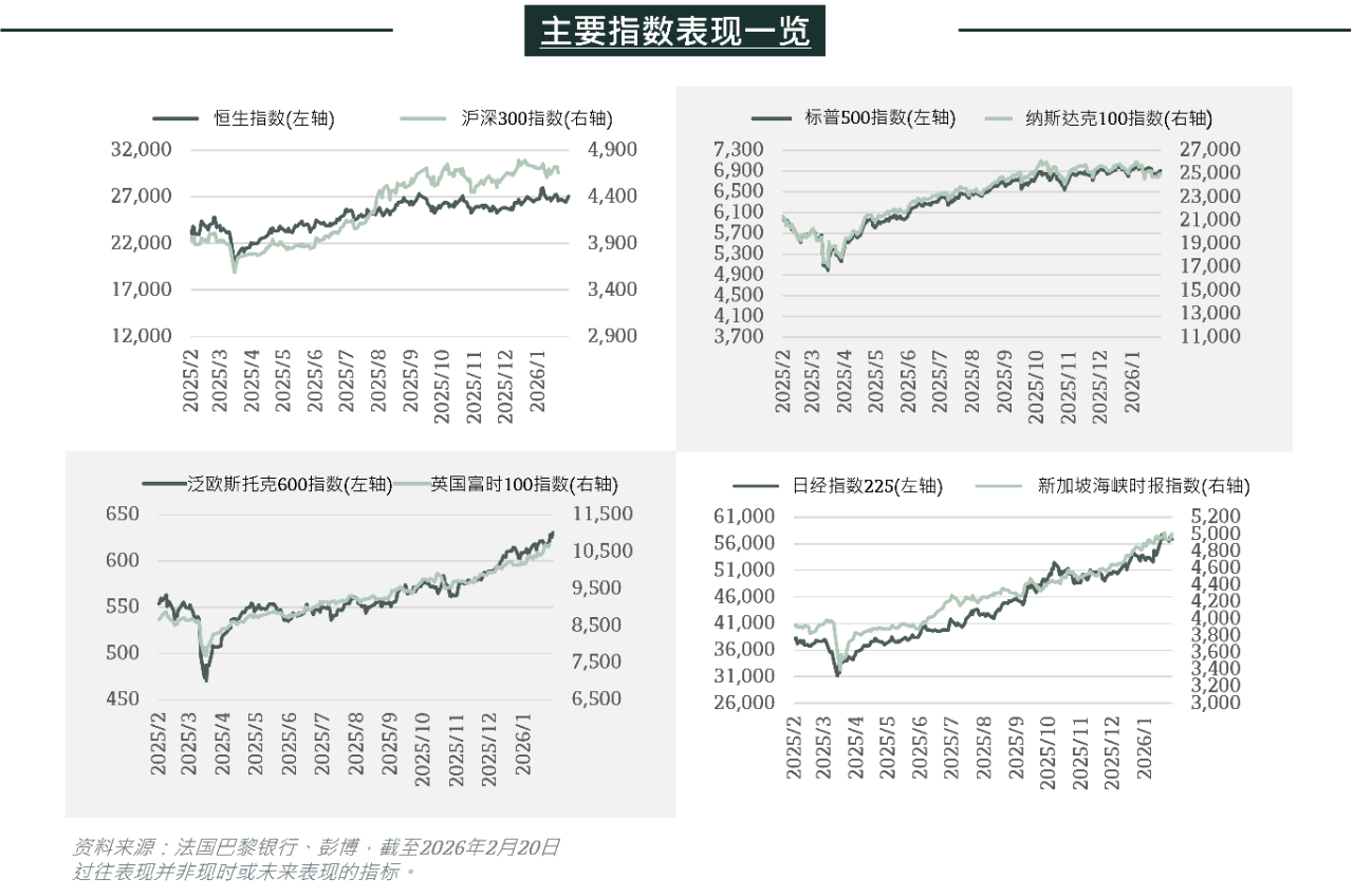 - 在地缘政治及经济不确定性持续的背景下,全球股市今年表现起伏。原先对人工智能的乐观情绪,现已转变为对行业颠覆性影响及估值过高的担忧。防守型/实体经济板块录得升幅,而科技股则出现回调。