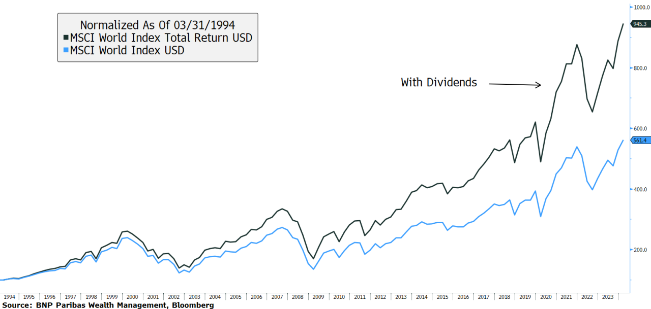 Chart 1: Dividends have accounted for approximately 40% of total equity returns in the last 30 years (MSCI World).