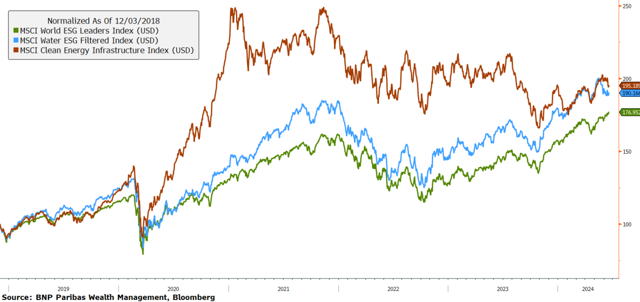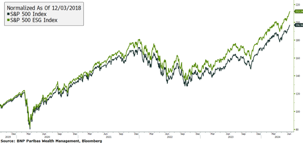 One of the most widespread approaches is to include ESG filters in stock market indices via exclusions and a positive screening (best-in-class selection process). In the chart below, we notice a stronger performance in the ESG version of the S&P 500 index compared to the traditional one over the past 5 years.