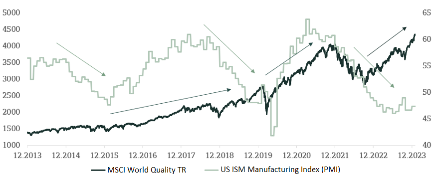 MSCI World Quality versus US ISM Manufacturing PMI