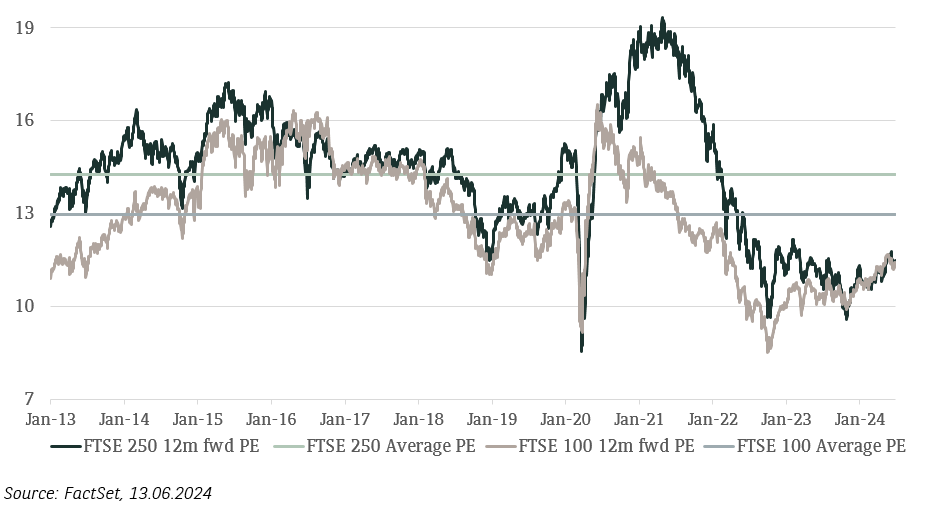 FTSE 100 and FTSE 250 indices P/E ratio versus historic average