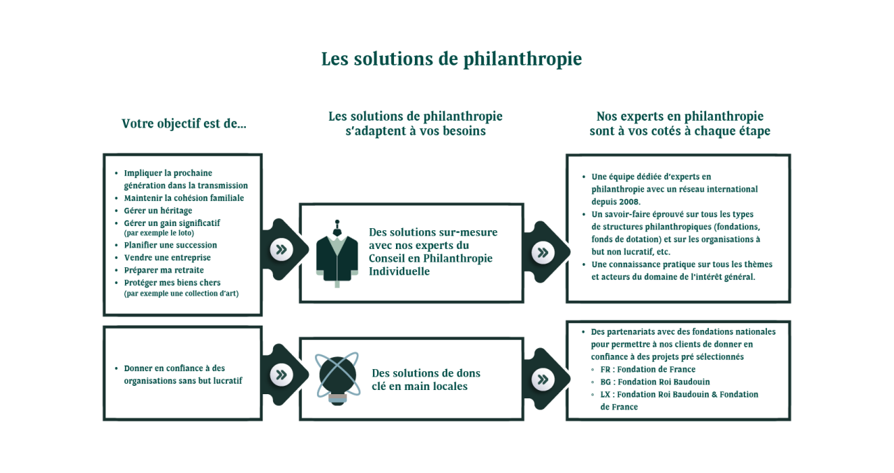 Il existe différents degrés d'investissement personnel et plusieurs manières de s'impliquer. Cela peut être en tant que donateur en direct jusqu'à la création de son propre véhicule philanthropique. En fonction de l'environnement juridique et fiscal, vos dons peuvent être éligibles à des avantages fiscaux, et vos donation et legs peuvent être exonérés de droits de succession, sous conditions.
