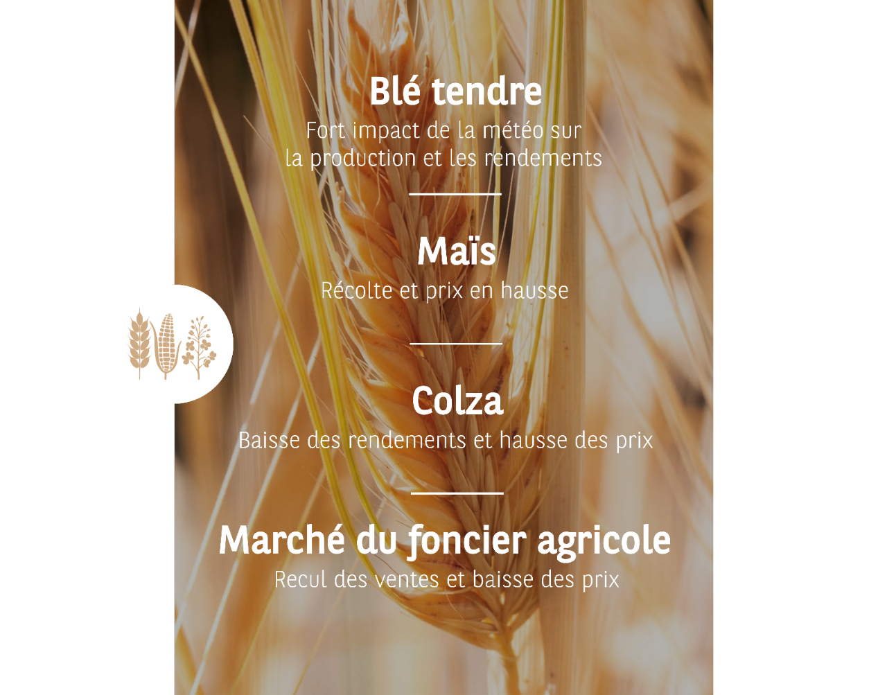 2024 constitue une mauvaise année pour la production céréalière française qui est en baisse de 17 % par rapport à 2023 et constitue la plus faible récolte depuis quarante ans pour atteindre 53,9 millions de tonnes. La production d’oléagineux et de protéagineux est également impactée par les mauvaises conditions météorologiques. En un an, la chute du prix de l’énergie (-20 %) et des engrais (-2,7 %) n’a pas compensé la baisse du chiffre d’affaires. Le revenu des céréaliers est en baisse.