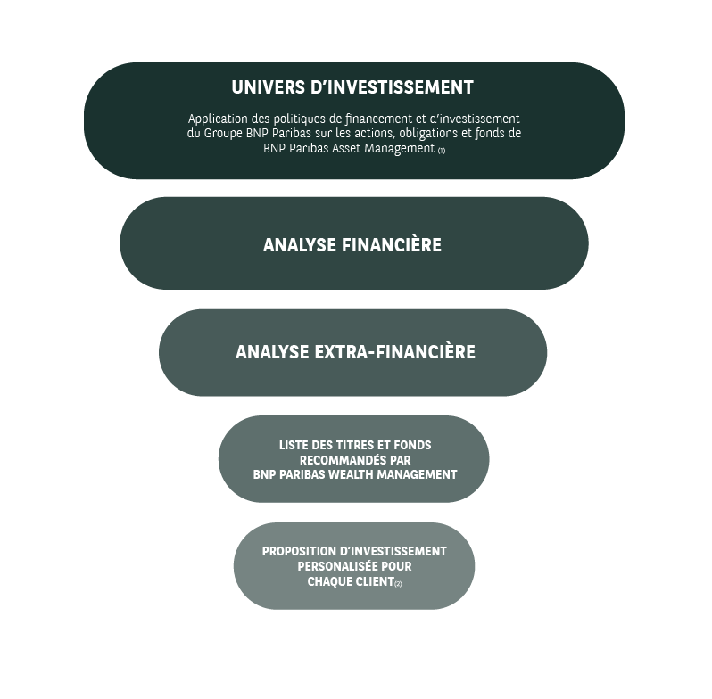 Tous les investissements sont analysés à travers des filtres de responsabilité grâce aux méthodologies de responsabilité de BNP Paribas Wealth Management appliquées à différentes classes d'actifs et reposant sur diverses sources d'information. Les titres individuels et les fonds communs de placement font l'objet d'une analyse approfondie afin d'évaluer leur potentiel, individuellement et dans le cadre d'un portefeuille plus large, en termes de risques/rendements.