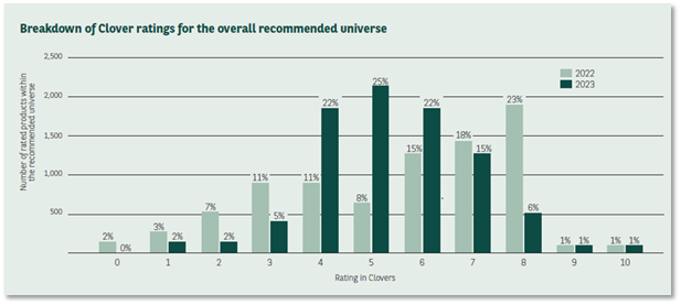 (1) In 2023, changes were made to the method of converting the score of issuers out of a 100 (received from BNP Paribas Asset Management) into Clovers in order to be more aligned with BNP Paribas Asset Management. The conversion is no longer made into a percentile, according to a defined correlation table, but rather into dozens. Hence, a score of 56/100 is now equal to five Clovers.